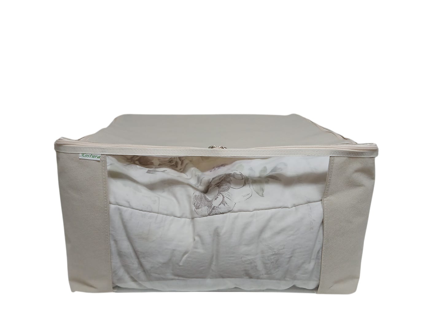 Material em Tnt 0,80 gramas; com visor em plástico transparente frontal na gramatura 0,30; bem reforçado e na parte superior também um visor de plástico 0,15gr; proporcionando uma ótima visualização para encontrar seu edredon; sem perder a organização.